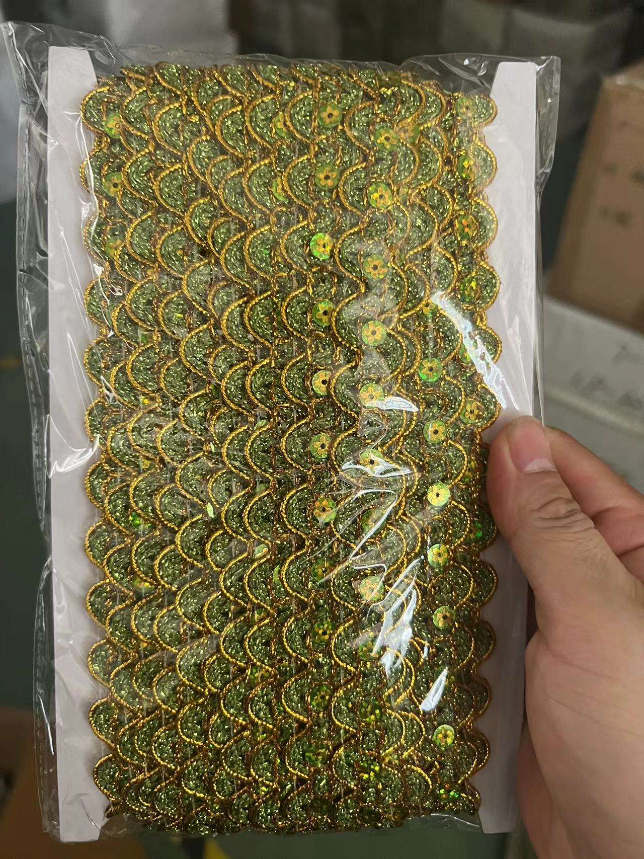 Klädtillbehör Guld och silver metallisk gränspets trim metallguld paljetter broderi Tatting spets trim antar metall paljett broderi-teknik och kombineras med den ihåliga spetsdesignen, vilket gör det lämpligt för klädtillbehörsdekoration.