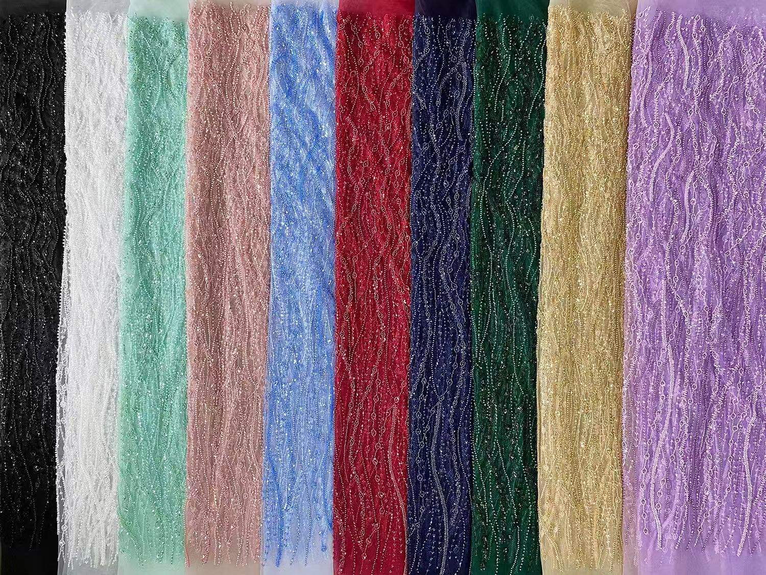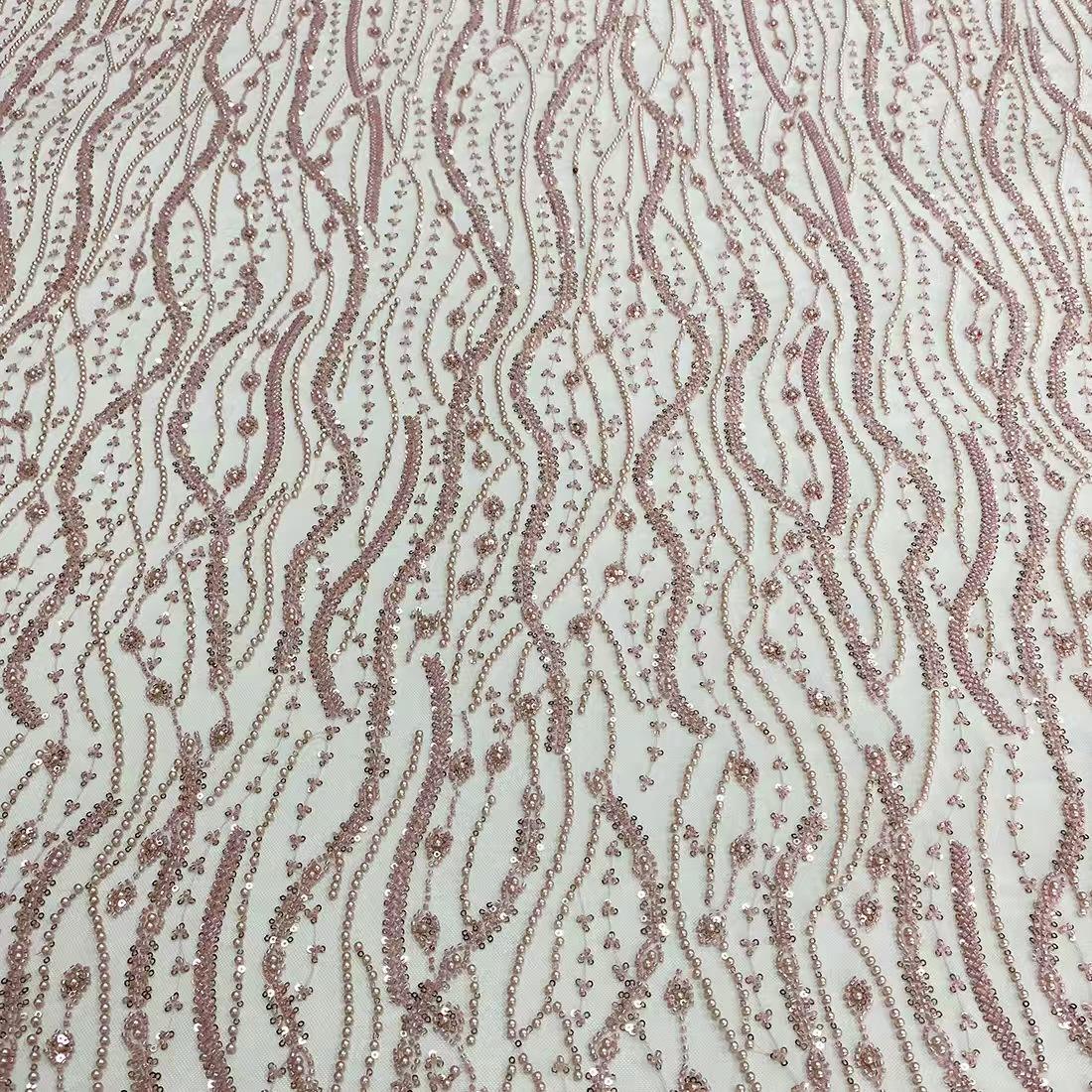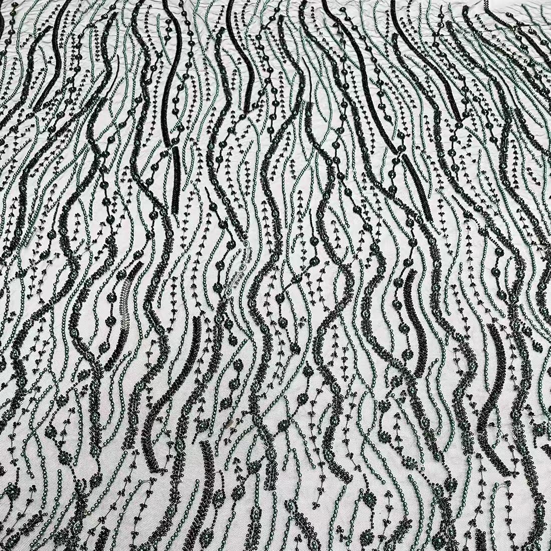 Nytt nät broderi pärlrör broderi afrikanskt tyg spetsar den innovativa nätbasen i kombination med tredimensionella pärlor rörbroderier utstrålar en stark afrikansk etnisk smak. Lämplig för haute couture, scendräkter och kulturella och kreativa kläder, stöder det anpassade mönster och färgkombinationer, vilket belyser den lyxiga och exotiska strukturen.