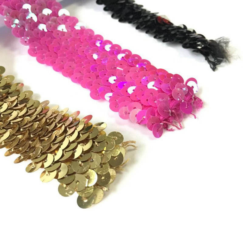 Olika bredd Bling Finish Braid Elastic Sequin spets trim Finns i flera bredder, den har en elastisk bas i kombination med glänsande paljetter, vilket ger den en lysande lyster. Det är lämpligt för scendräkter, aftonklänningar och sko- och hattdekorationer